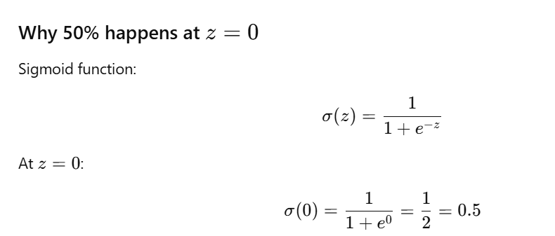 In a sigmoid function, 50% probability ALWAYS occurs at z=0