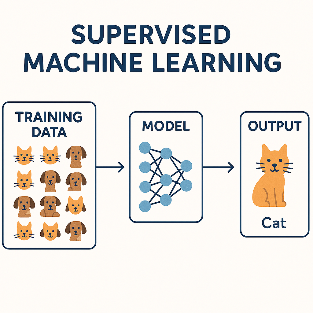 Supervised learning means the machine learns from labelled examples—just like students learning from a teacher who shows them the right answers.